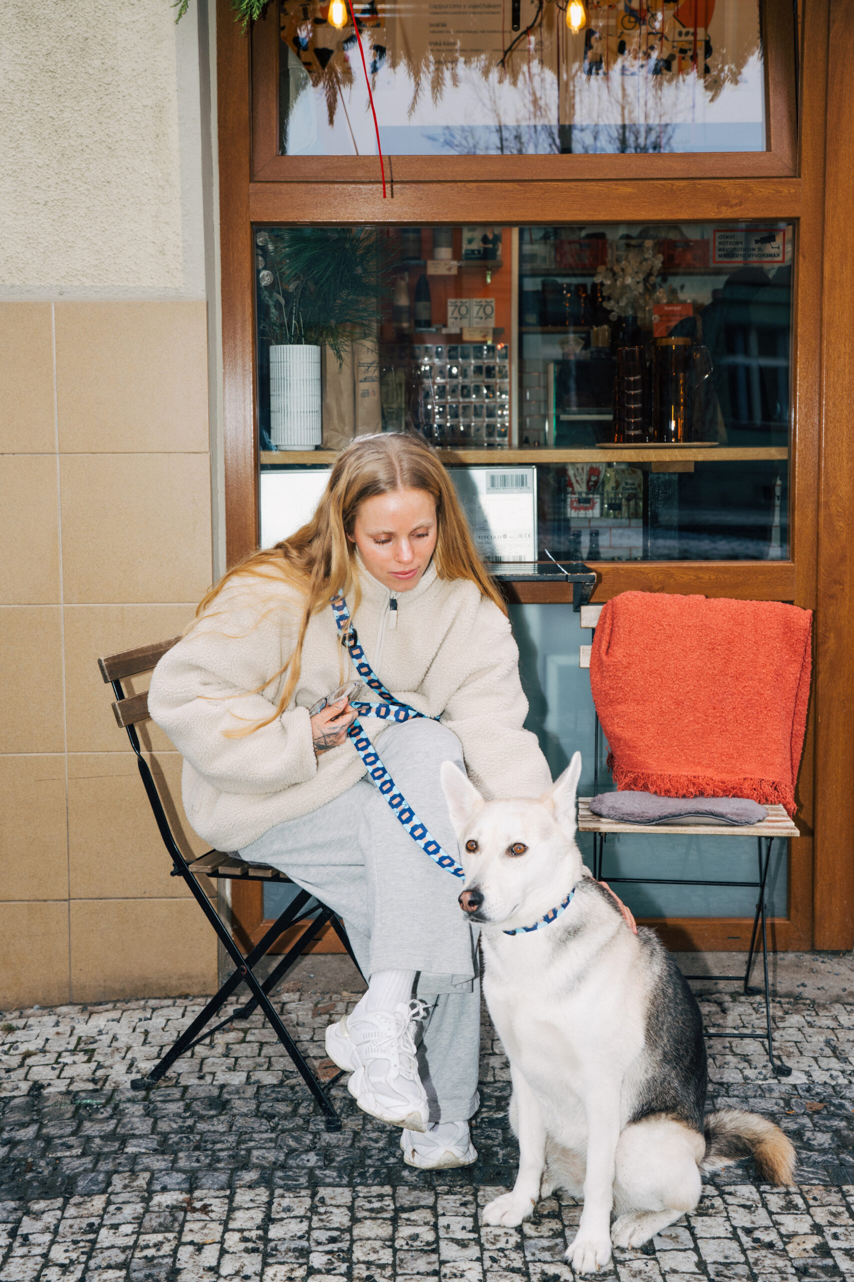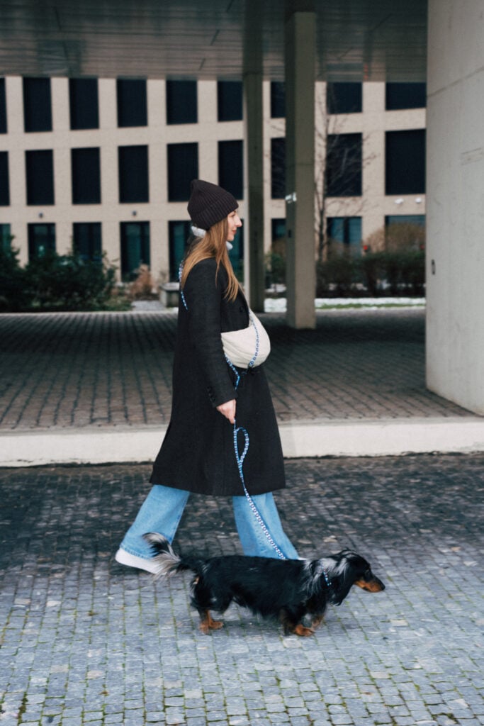 Vodítko kolem hrudníku a ruce v kapsách